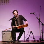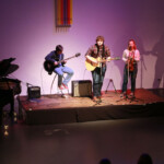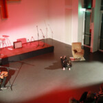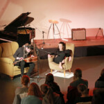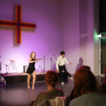 Nach einer kurzen Pause ging es weiter mit Charlet. Sie ist Singer-Songwriterin und sang mehrere eigene Lieder, die sie selbst auf dem Flügel begleitete. Dann kam Lena zum zweiten Mal auf die Bühne, dieses Mal mit dem Jazzdance Kurs der KSHG. Die Gruppe bestehend aus Anfängerinnen und Fortgeschrittenen, tanzte auf eine Remixversion des Stücks „Hanging Tree“. Ebenfalls zum zweiten Mal kam Oliver danach zurück, der nun alleine sang und eigene Stücke auf der Gitarre spielte, die er gleichzeitig als Percussion Instrument nutzte. Den Abschluss des Abends bildete die Band „With wine and violin“. Das Trio (normalerweise ein Quarttet) zeigte mit Geige, Gitarre und Gesang eigene Stücke. Und auch hier gab es am Ende noch eine Prämiere, der Gitarrist Jan-Lucas sang zum ersten Mal vor Publikum.